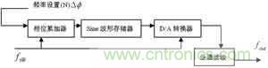 基本模型如图1所示,主要由时钟频率源fclk、相位累加器、波形存储器(ROM)、数/模转换器(D/A)、以及低通滤波器(LPF)组成。输出信号波形的频率表达式为: