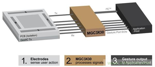 其中比较有代表性的,要数Microchip公司的GestIC技术。它基于电场感应的原理,在电子设备周边的空间中形成一个电场。当手部在空间中运动时会使电场发生畸变,布设在电场中的电极接收器会感应到这种变化,并通过专门的控制芯片进行信号处理,对手势进行识别和运动追踪,并将数据传递给电子设备做出响应。Microchip代理商世健公司产品经理介绍,与采用摄像头的光学3D手势识别技术相比,GestIC技术最大的优势在于功耗极低,能耗节省多达90%,同时能避免环境光等外部因素的干扰,虽然是一个近场识别技术,但其在家庭自动化、家电控制、音响系统、电脑及配件、汽车电子等方面,会有诸多应用场景。