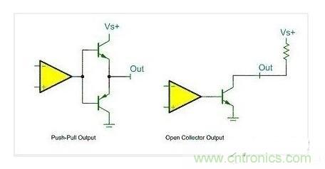 关于推挽输出和开漏输出,最后用一幅最简单的图形来概括:该图中左边的便是推挽输出模式,其中比较器输出高电平时下面的PNP三极管截止,而上面NPN三极管导通,输出电平VS+;当比较器输出低电平时则恰恰相反,PNP三极管导通,输出和地相连,为低电平。右边的则可以理解为开漏输出形式,需要接上拉。