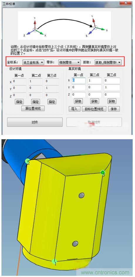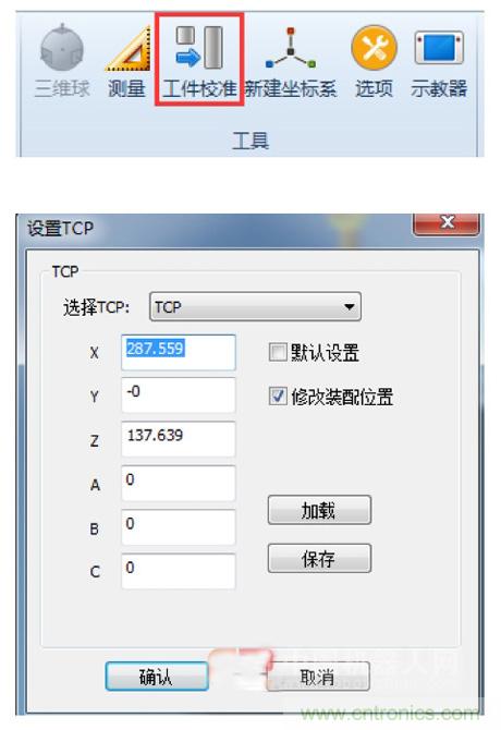 然后,我们对零件的三维模型进行工件校准以及对工具的TCP进行设置,完成此步骤后零件和工具的位置就已经和实际的位置保持一致了。