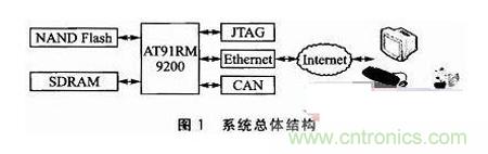 支持远程自动更新的嵌入式Linux系统机构,它可以分为嵌入式终端和远程管理系统两部分。系统的总体结构如图1所示,嵌入式终端采用基于ARM9架构的AT91RM9200微处理器,采用扩展的32MB SDRAM,由2片16位数据宽度的SDRAM芯片HY57V281620并连而成,采用64MB NANDFla sh存储芯片K9F1208,运行嵌入式Linux系统。远程管理系统选用PC机。嵌入式终端通过以太网连接到远程管理系统,管理人员可以通过telne t即可对各个嵌入式终端进行监控、管理和远程更新。