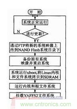 本设计对uboot和Linux内核进行改造,使其支持YAFFS2文件系统,对系统添加ftp、telnet等应用服务。系统更新流程如图2所示。系统正常运行时管理人员可以通过telnet远程登录到嵌入式终端进行监控和管理。当需要对系统进行更新时,通过远程管理系统的ftp客户端登录到嵌入式终端,将需要更新的内核映像和文件系统上传到NAND Flash。上传完毕后对原有的内核映像和文件系统进行备份并重启系统。系统重启后uboot将NAND Flash中更新后的内核映像和文件系统搬运到SDRAM中,然后跳转到SDRAM中启动Linux系统,挂载YAFFS2文件系统,启动各种应用服务。