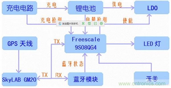 充电IC选用性价比高的EUP8054,最大充电电流可达800mA,并可用外部电阻来调节充电电流;锂电池容量选择在1000mAh以上,整机工作电流在50mA左右,因此易实现超过15小时的连续工作时间;蓝牙??槲的诩嫒菪粤己玫腃SR方案,并且蓝牙天线为直接画在PCB上的微带线,节省成本;3个LED全部由MCU来控制,可分别指示蓝牙状态、GPS定位状态及充电状态等,也可依客户要求来定做不同的显示模式。