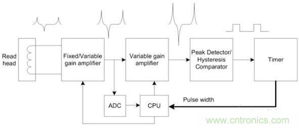 图6显示了一个完整的系统。最好将放大电路做成两级,用ADC接收第一级电路的输出。这样就无需高分辨率ADC,8位ADC就足以满足这种应用需求。第一级可以是固定增益的放大器,也可以是可变增益放大器。第二级是可变增益放大器。CPU读取ADC结果,并通过调整增益使第二级放大器的信号输出达到最佳。第二级放大器的输出送到峰值检测器/磁滞比较器电路进行峰值检测。来自检测器的脉冲输出被馈送至定时器进行时间差测量,然后由CPU解码出1和0。