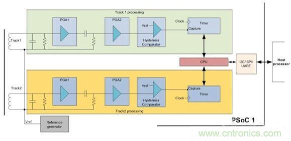 图9显示了基于赛普拉斯PSoC 1的双磁道磁卡读卡器实现方案。PSoC 1处理器具有与8位处理器内核集成在一起的可配置模拟和数字块,在单颗芯片上集成了所有的功能。需要注意的是,图中所示的无源器件是在处理器的外部。
