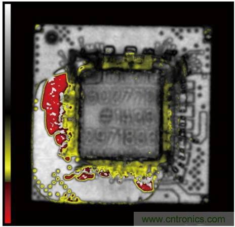 图2. 过度加热引起PBGA器件的基板和塑封材料之间分层(通过扫描声学显微镜观测)