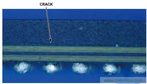 图3. 过度加热导致PBGA上出现裂纹的低放大率图像(侧视图)