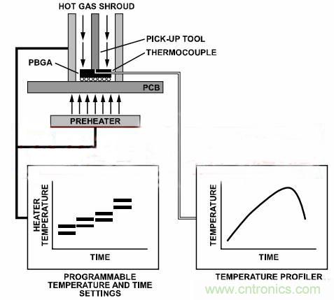 将PBGA器件装配到PCB上之后,若发现缺陷,应当返修以移除不良器件,并换上工作正常的器件。移除器件之前,应加热不良器件直至焊接接头液化,以便于从电路板上移除不良器件。