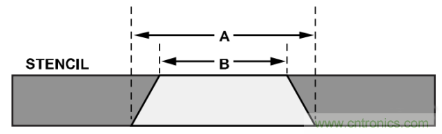 可利用模板来将焊膏涂敷到PCB焊盘上。模板对齐精度是使回流焊锡处理保持均匀的关键。使用与电路板装配相同的PBGA孔径几何图形和模板厚度。使用梯形孔径(参见图7)以确保焊膏均匀释放并减少污点。