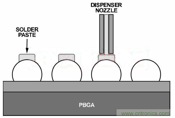 某些情况下,利用模板将焊膏均匀精确地涂敷在PCB焊盘上可能不可行,尤其是对于器件密度高或几何空间紧张的电路板。这种情况下,应考虑将焊膏涂敷在器件底部的焊球上。为此,可利用模板将焊膏涂敷在焊球上端,或将焊膏分配给所有焊球(参见图8和图9)??衫米派杓频募芯吆?或返修设备来达到这一目的。