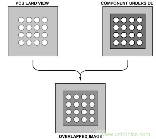 将器件精准贴放到电路板上是很重要的。带分光束光学系统的贴片设备有助于PBGA和电路板的对齐。此类成像系统涉及到将PBGA焊球镜像叠放在PCB焊盘镜像上(参见图10)。贴片机必须具有支持用户沿x轴和y轴进行微调(包括旋转)的能力。