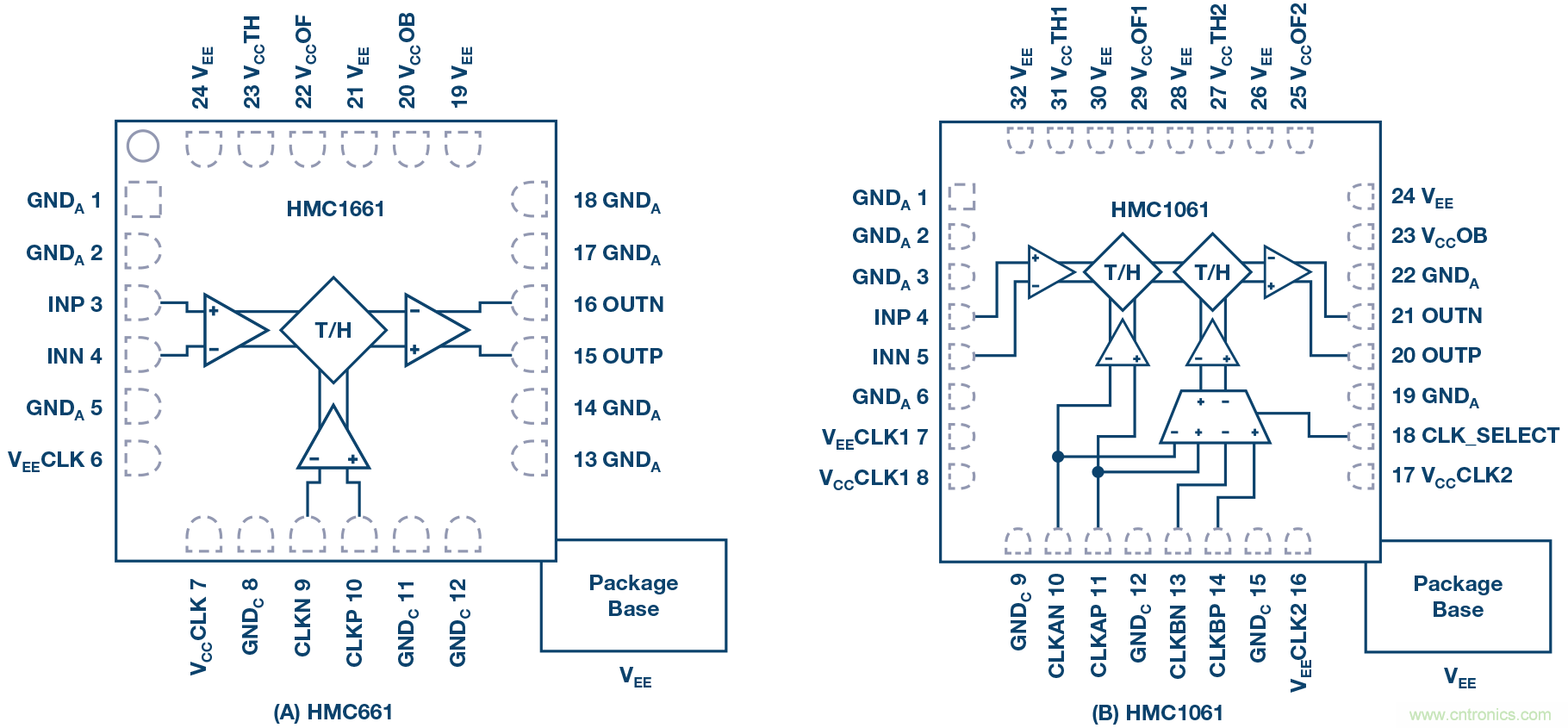 ADI的THA系列产品可以在18 GHz带宽范围内提供精密信号采样,在DC至超过10 GHz的输入频率范围内具有9到10位线性度、1.05 mV噪声和< 70 fs的随机孔径抖动性能。该器件可以4 GSPS工作,动态范围损失极小,具体型号包括HMC661 和 HMC1061。这些跟踪保持 放大器可用于扩展高速模数转换和信号采集系统的带宽和/或高频线性度。