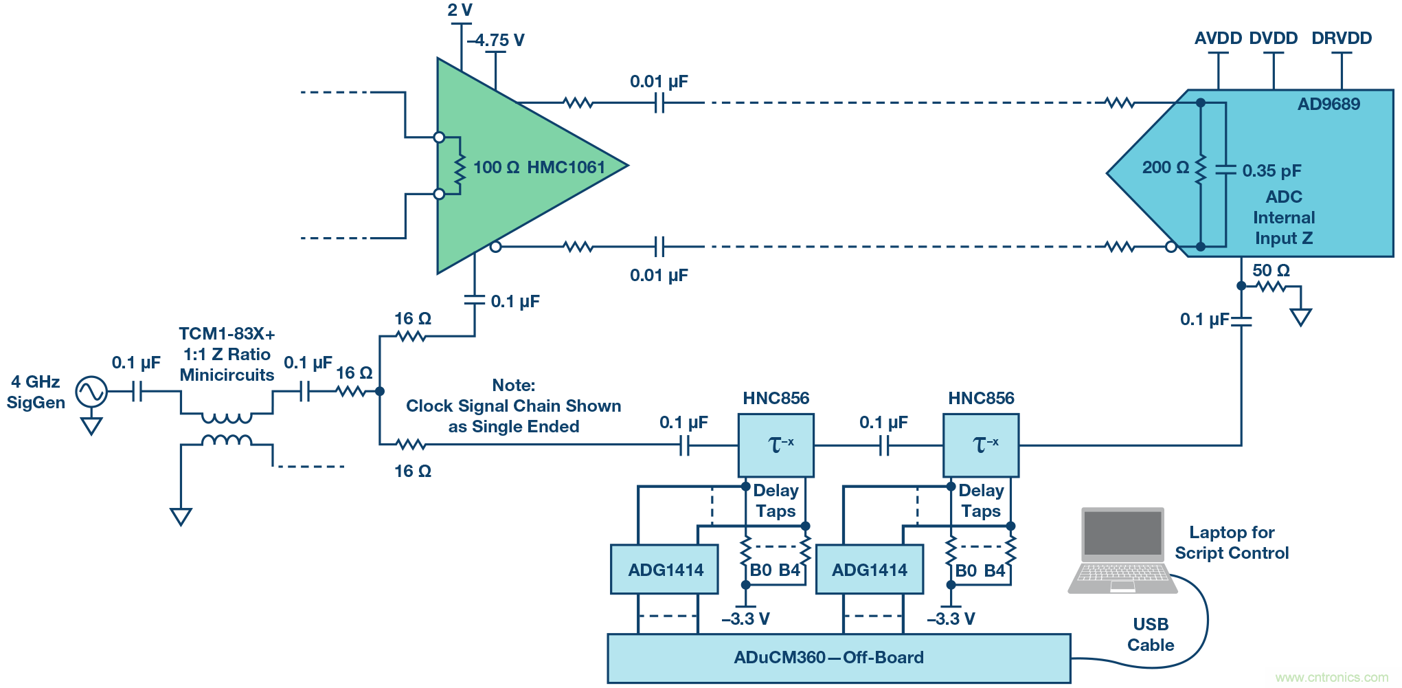 在电路板上完成该过程可能冗长乏味,因为纸面分析可能不会考虑PCB板上时钟走线传播间隔造成的相应延迟,内部器件组延迟,ADC孔径延迟,以及将时钟分为两个不同段所涉及到的相关电路(一条时钟走线用于THA,另一条时钟走线用于ADC)。设置THA和ADC之间延迟的一种方法是使用可变延迟线。这些器件可以是有源或无源的,目的是正确对准THA采样过程的时间并将其交给ADC进行采样。这保证了ADC对THA输出波形的稳定保持模式部分进行采样,从而准确表示输入信号。
