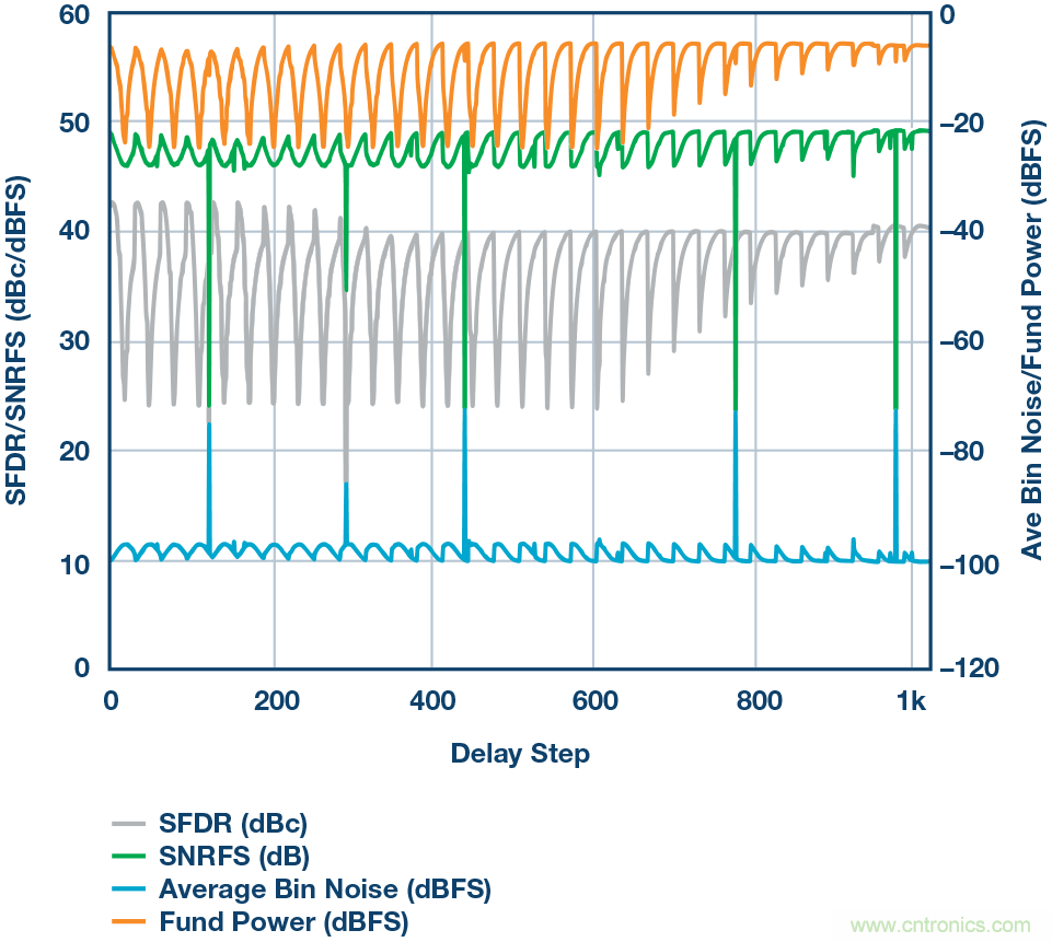图3a. 每个延迟设置上信号幅度和SFDR性能的映射结果。
