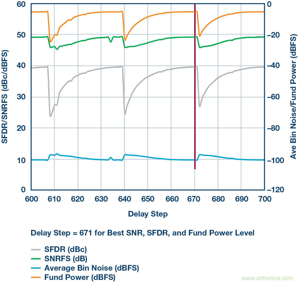 结果如图3a所示,基波功率、SFDR和SNR将随所应用的每个设置而变化。如图所示,当把采样位置放在更好的地方(THA将样本送至ADC的过程之中)时,基波功率将处于最高水平,而SFDR应处于最佳性能(即最低)。图3b为延迟映射扫描的放大视图,延迟设定点为671,即延迟应该保持固定于此窗口/位置。请记住,延迟映射程序仅对系统的相关采样频率有效,如果设计需要不同的采样时钟,则需要重新扫描。本例中,采样频率为4 GHz,这是该信号链中使用的THA器件的最高采样频率。