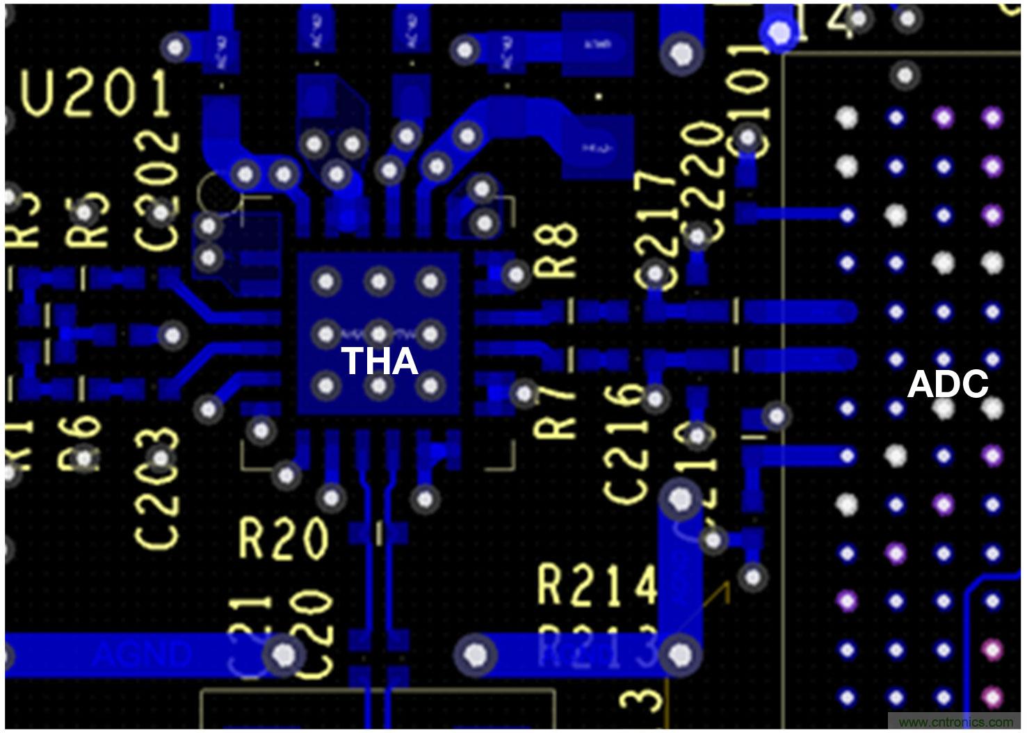 信号通过差分模式连接到THA输入(我们同时是也提供单端射频信号输入的参考设计链路),形成单一前端网络。为了最大限度地减少过孔数量和总长度,我们在这里特别小心,让过孔不经过这两条模拟输入路径,并且帮助抵消走线连接中的任何线脚。