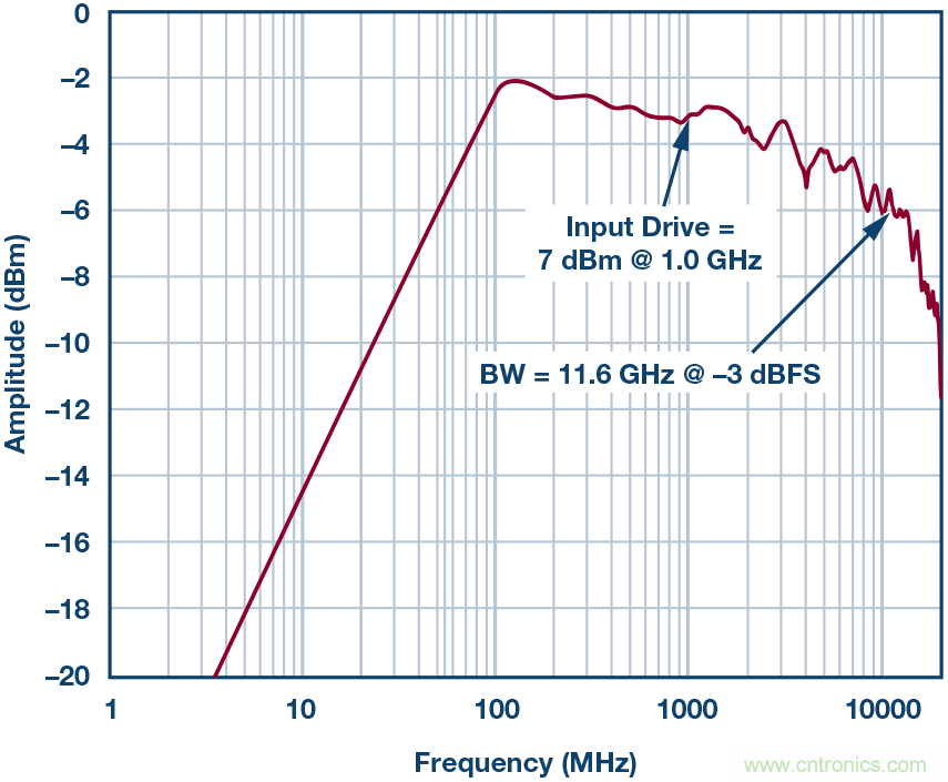 图7显示了通带平坦度,证明在RF ADC之前增加一个THA可以实现 10 GHz的带宽,从而充分扩展AD9689的模拟带宽。
