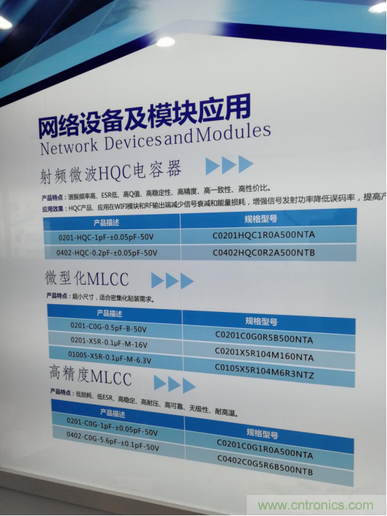 在展区,宇阳科技展示了各种应用的电容,如网路设备及??橛τ蒙淦滴⒉℉QC电容器、手机应用中超微型MLCC、用于安防产品高温型MLCC、用于汽车电子应用中的高容MLCC等。
