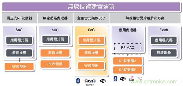 · 全整合式无线SoC:这是一种单芯片的单一建置方案,适用于特定的无线技术,尤其是用于物联网应用的低功耗蓝牙技术。链路层和PHY整合于SoC中,以执行所有的软件堆栈和应用程序代码。