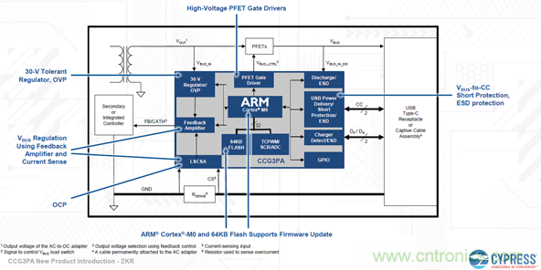 如图2所示,CCG3PA具有高集成度,与通过使用分立组件实现的功能等效系统相比,具有组件数量更少、电路板占位面积更小、电路板布局更简单以及材料成本和PCB成本更低的优势。