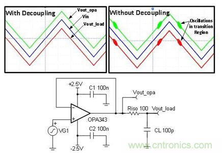 未采用去耦电容的器件无法提供暂态电流,因此放大器的内部节点会下垂(通常称为干扰)。无去耦电容的器件其内部电源干扰会导致器件工作不连续,原因是内部节点未获得正确的偏置。