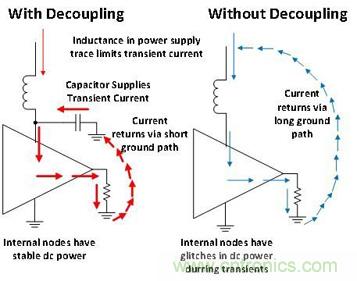 去耦电容与器件非常接近,因此电流路径的电感很小。在暂态过程中,该电容器可在非常短的时间内向器件提供超大量的电流。