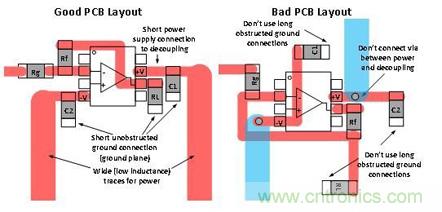 图 3 将良好的去耦合板面布局与糟糕的布局进行了对比。您应始终尝试着让去耦合连接保持较短的距离,同时避免在去耦合路径中出现通孔,原因是通孔会增加电感。大部分产品说明书都会给出去耦合电容器的推荐值。如果没有给出,则可以使用 0.1uF。