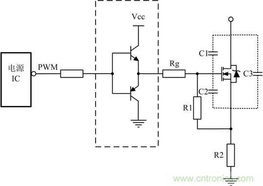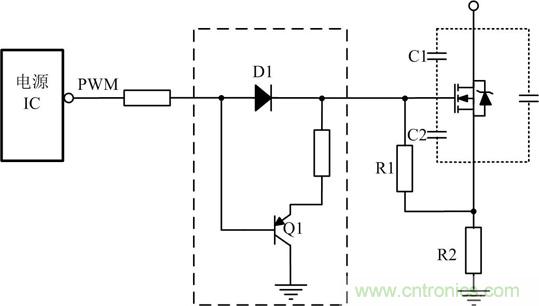 如果选择MOS管寄生电容比较大,电源IC内部的驱动能力又不足时,需要在驱动电路上增强驱动能力,常使用图腾柱电路增加电源IC驱动能力,其电路如图 2虚线框所示。