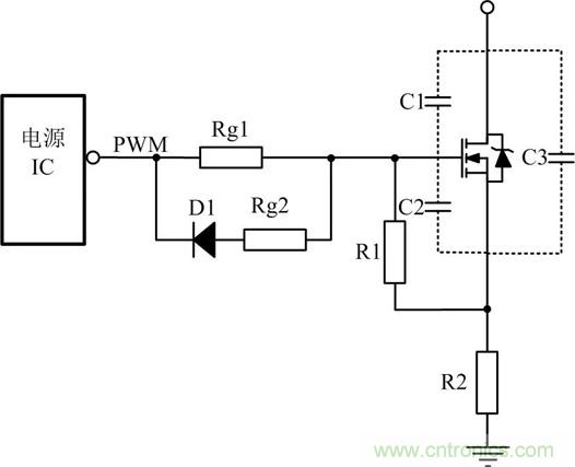 关断瞬间驱动电路能提供一个尽可能低阻抗的通路供MOSFET栅源极间电容电压快速泄放,保证开关管能快速关断。为使栅源极间电容电压的快速泄放,常在驱动电阻上并联一个电阻和一个二极管,如图3所示,其中D1常用的是快恢复二极管。这使关断时间减小,同时减小关断时的损耗。Rg2是防止关断的时电流过大,把电源IC给烧掉。