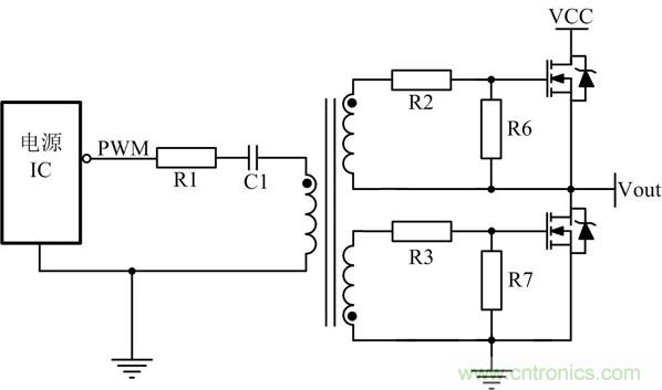为了满足如图5所示高端MOS管的驱动,经?;岵捎帽溲蛊髑?,有时为了满足安全隔离也使用变压器驱动。其中R1目的是抑制PCB板上寄生的电感与C1形成LC振荡,C1的目的是隔开直流,通过交流,同时也能防止磁芯饱和。