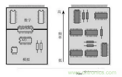 上面的两种情况,说明数?;旌系グ逯?,模拟电路极易受到干扰,会影响信噪比等指标。所以在数?;旌系グ?PCB 设计过程中,要对布局布线提出很高的要求。
