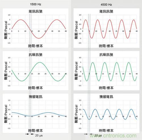 前馈降噪带宽,在低频处被耳机驱动??橄拗圃?0Hz左右,在高频处被声学结构和讯号处理延迟限制于3kHz。延迟会导致难以在抗噪讯号和噪声讯号之间实现180度的相位反转,高频部份因为波长较短更难处理。图2显示了两种频率下20μs延迟对降噪效果的影响:频率为1500Hz时,残余噪声约剩1/5(14dB ANC),但频率为4500Hz时,即使延迟不变,残余噪声也已增加到3/5(仅4dB ANC)。