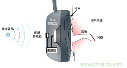 前馈降噪系统,由耳机输出与环境噪声频响相同但相位相反的讯号来实现降噪。如图1,前馈麦克风侦测噪声并透过滤波电路产生反相讯号,在耳鼓处反相讯号与噪声讯号抵消,从而降低人耳听到的噪声级。这里的滤波电路主要用来补偿耳鼓和麦克风处侦测到的噪声之间差异,另外对于喇叭本身在降噪讯号的响应能力方面也有补偿作用。