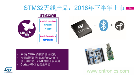 为应对日益复杂的物联网协议及行业标准,STM32WB应运而生。作为STM32系列最重要的无线产品之一,STM32WB的“W”代表无线,“B”代表蓝牙。它融合了STM32的生态系统和架构,以及开放射频,拥有2个CPU、2个调制解调器和射频收发器,能够覆盖更多的应用领域,特别是无线应用。STM32WB的双核(CM0+ 内核负责协议栈)保留了Arm® Cortex®-M4部分,其复制了L4系列的架构,这意味着用过L4产品的开发商可以轻松使用STM32WB产品。而且STM32WB的部分产品样片已经在今年2月份面世,预计到年底就能实现大规模上市。