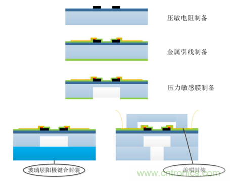 SOI高温压力传感器的制备工艺涉及多道MEMS工艺,此处简单介绍一些关键步骤以供了解传感器的工艺过程,如图3所示,主要包括压敏电阻制备、金属引线制备、压力敏感膜制备以及压力腔封装等工艺。