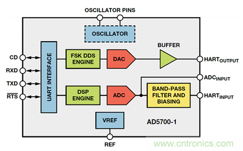 图 2 中显示的其他三个模块是上文提及的UART接口、内部基准和振荡器。RTS和TXD是用于调制的重要信号,而CD和RXD则对解调非常重要。AD5700 可以接收外部 2.5 V基准,只有在AVDD电源大于 2.7 V时才能使用。对内部或外部基准选项的使用受REF_SEL针脚的极性控制。对于时钟,该器件支持多个方案,以实现简单的低成本可配置解决方案。AD5700 可以使用外部晶体、陶瓷谐振器或CMOS输入。AD5700-1 是首款集成内部低功耗 0.5%精密振荡器的HART调制解调器IC,降低了所需的外部电路以及总体成本。众多片上集成功能显著简化了HART兼容系统的设计,从而提供更加可靠和经济高效的稳定网络解决方案。