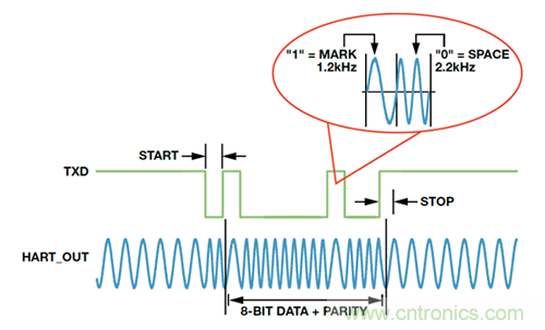 图 2 显示了调制涉及的主要??椋篎SK直接数字合成 (DDS)引擎、DAC(开关电阻串类型)和缓冲区。要发送的数字数据通过UART输入。调制器通过将RTS(请求发送)信号拉低来使能。调制器将TXD输入端的UART编码HART数据位流转换成一系列二进制 1200 Hz(“1”)和 2200 Hz(“0”)信号音(见图 3)。DDS在任何一种频率下生成正弦数字字流,DAC将其转换为大约 493 mV的p-p模拟正弦波。此正弦波信号在内部进行缓冲并在HART_OUT引脚上输出。该DDS引擎本身会产生连续相位信号,因此在频率之间切换时避免了出现任何输出不连续。在HART_OUT上进行内部缓冲的主要优势是产生很高的驱动能力,无需外部模拟缓冲,也不会出现它们带来的问题。HART_OUT引脚直流偏置至 0.75 V,并应容性耦合至负载。有关更多详细信息,请参见AD5700/AD5700-1 数据手册。