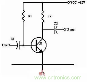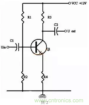 同理,当输入信号减小时,则Ib减小,Ic电流减小,则电阻R2的电压U2=Ic×R2会随之减小,Uce=VCC-U2,会变大。在输入信减小时,Uce最大变化是从1/2的VCC变化到VCC。这样,在输入信号一定范围内发生正负变化时,Uce以1/2VCC为准的话就有一个对称的正负变化范围,所以一般图1静态工作点的设置为Uce接近于电源电压的一半。