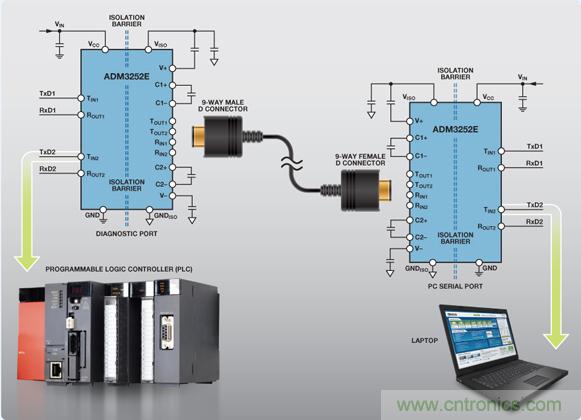 要在恶劣的工业环境下实现鲁棒的数据通信链路,RS-232 诊断端口必须在 RS-232 电缆网络与相连系统之间提供一个隔离接口,以预防高噪声环境中的电压尖峰和接地环路并提高系统稳定性(图 1).RS-232 通信链路的电源隔离利用隔离式 DC/DC电源或 ADI 公司的 isoPower®集成式 DC/DC 转换器技术实现。