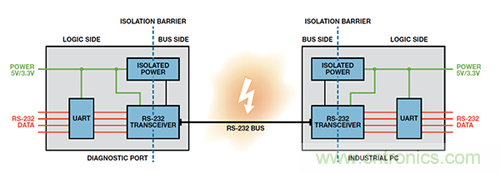 如图 2 所示,隔离栅在 RS-232 总线和与该总线相连的每个系统之间提供电隔离,既允许在两点之间传输数字数据,又可防止接地环路电流流过;这样可以消除耦合到通信电缆上的噪声,从而降低信号失真和误差。