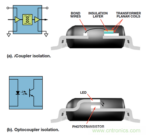 图 4 比较了两种主要隔离技术。iCoupler 技术(图 4(a))利用厚膜工艺技术构建可实现 2.5 kV 隔离的微型片上变压器,从而在 RS-232 系统中提供信号隔离。较古老但广泛采用的光耦合器解决方案(图 4(b))则采用发光二极管(LED)和光电二极管。LED 用于将电信号转换为光,光电检测器则用于将光转换回为电信号。电光转换本身的低转换效率导致功耗相对较高;光电检测器的慢速响应则限制其速度;而老化问题会限制其使用寿命。