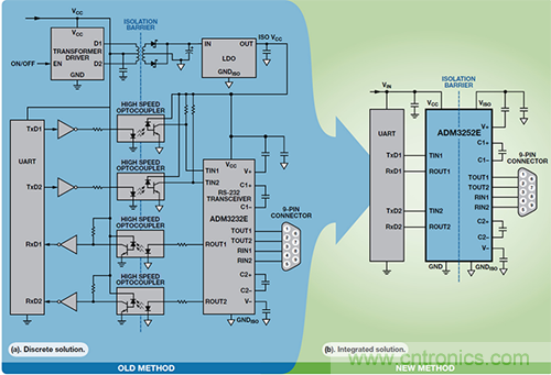 图 5. 隔离式 RS-232 设计比较