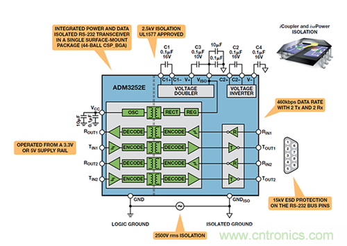 ADM3252E即是这样的一个例子,它是一个紧凑器件中的隔离式双通道RS-232 收发器。iCoupler隔离技术至少在以下五个方面克服了旧式光耦合器解决方案所造成的限制:集成(由于iCoupler支持双向操作,因此可缩小总体尺寸并降低系统成本)、性能更高、功耗更低、易于使用且可靠性更高。