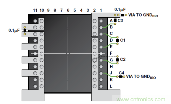 隔离收发器的PCB布局对于确保在实际设计中实现2.5 kV的额定隔离性能至关重要。主要考虑因素是逻辑端GND和总线端GND之间的爬电距离(沿壳体最短距离)和电气间隙(最短空气距离)。ADM3252E的逻辑接口不需要外部电路。输入和输出供电引脚需要电源旁路(图 7)。欲了解有关PCB布局指南和辐射(EMI)控制结构的更多信息,请参考AN-0971 应用笔记“isoPower器件的辐射控制建议”。