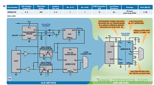 图8. 单通道 RS232 收发器应用 (a) ADM3251E 规格(b) 传统方法 (c) iCoupler + isoPower 方法