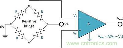 惠斯通电桥(或单臂电桥)电路应用非常广泛,如今在现代运算放大器中,我们可以将惠斯通电桥电路与各种传感器连接。不同于将一个未知阻值与已知阻值相比,惠斯通电桥在电路中有很多用法。惠斯通电桥电路就是在电源端和接地间两个简单的电阻串并联,当电桥达到平衡时两个并联分路间产生零压差。