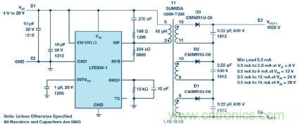 LT8304-1 反激式转换器设计采用的组件较少。图 1 显示一款完整的 4 V~28 V 输入至 1000 V 输出解决方案,其能够支持 15 mA 负载。输出电流能力 随着输入电压的增加而提高,当输入电压高于 24 V 时可达到 13mA。由于 LT8304-1 可通过原边波形检测输出电压,因此无需配置大尺寸高电压分压器,也不必采用光耦合器。