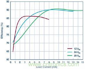 图 2:图 1 所示转换器在各种不同输入电压条件下的效率。
