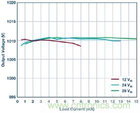 图 6:图 4 所示解决方案在各种不同输入电压条件下的负载调节性能。