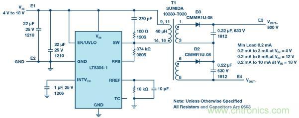 图 4:一款提供 4 V 至 18 V 输入的完整 800 V/10 mA 隔离型反激式转换器。